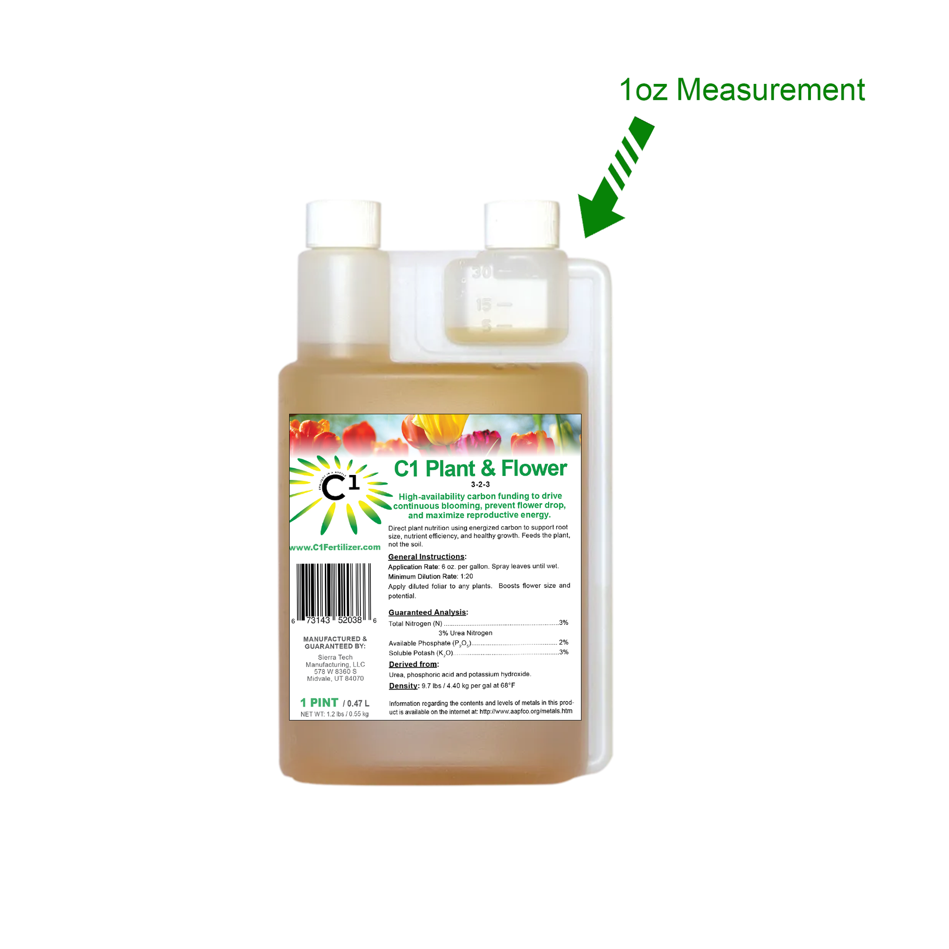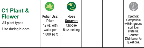 Directions: Dilute C1 Plant & Flower with water and spray on leaves and bloom till wet. May be applied weekly, monthly or based on plant timings. May be applied with hose end sprayer or tank sprayer at 6 ounces per 1000 square feet.  Minimum dilution is 1:20. See program for specific plant timings.